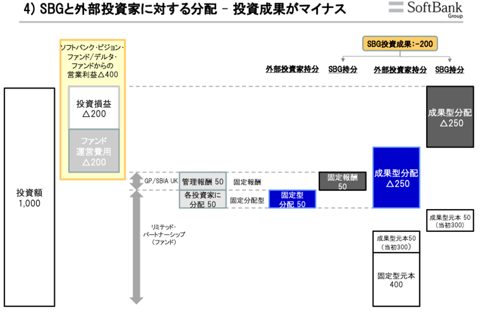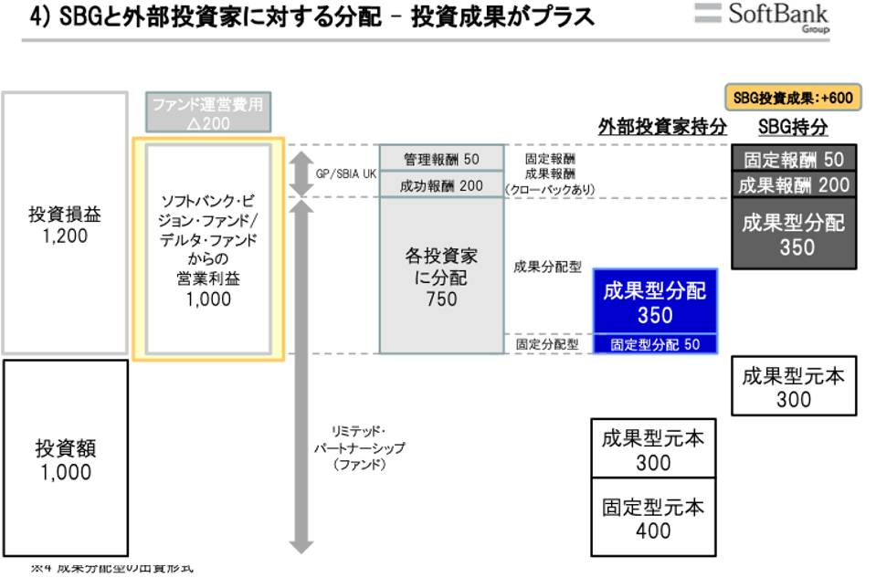 æè³é¡1,000ã«å¯ŸããŠå©ç1,200ãåŸãããå ŽåããŸãã¯ãããããã¡ã³ãã®éå¶è²»çš200ãå·®ãåŒãããæ®ãå©çã¯1,000ãšãªããããã«ããããGPïŒSBIA UKïŒãžå ±é ¬250ïŒç®¡çå ±é ¬50ã»ææå ±é ¬200ïŒãæ¯æãããæ®ã£ã750ãLPæè³å®¶ãžåé ãããããšã«ãªããŸãã