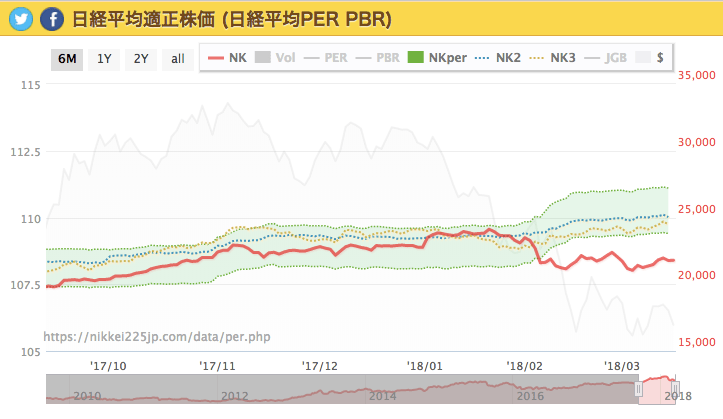 例えば毎日公表されている日経平均のPER・PBRは次のページで確認できますが、過去数年の日経平均の推移とあわせて確認してみましょう。