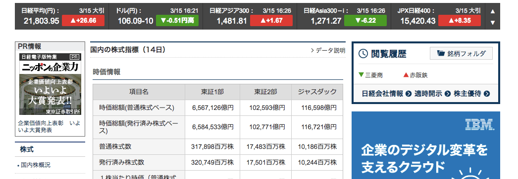 次の日本経済新聞のページでは毎営業日の国内の株式指標をチェックすることができ、将来の株価予測、相場の変動を予想するのに役立ちます。