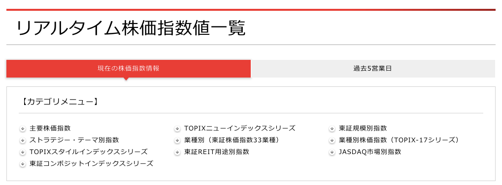 日本取引所グループ(JPX)のサイトからは、リアルタイムでたくさんの株価指数が確認できます。