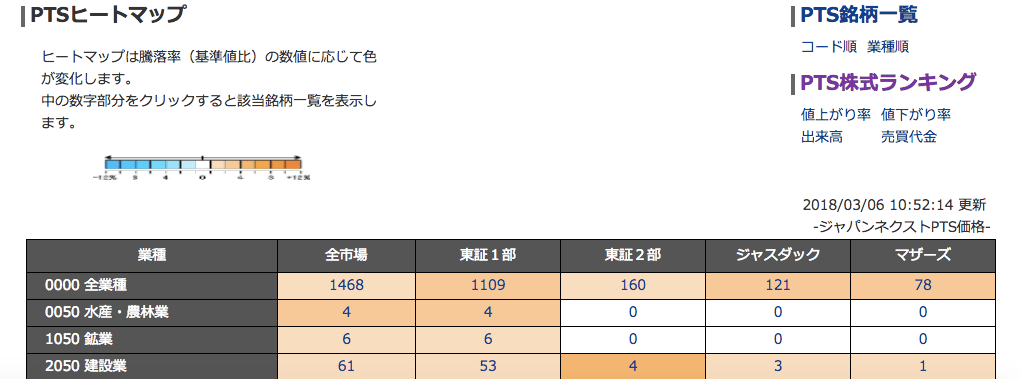 大きく分けて「PTS銘柄一覧」「PTS株式ランキング」「PTSヒートマップ」の3つがあります。