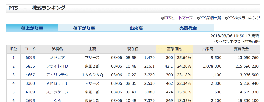 大手投資情報サイトのモーニングスターでは、リアルタイムにPTSにおける株価の一覧を見ることができます。