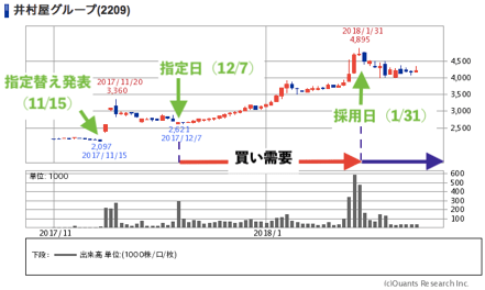 これは、昨年東証2部から東証1部へ指定が行われた井村屋グループ(2209)の、指定替え前後のチャートです。