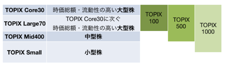 TOPIXには、時価総額の大きさや流動性の大きさによって構成銘柄を分類した指標もあります。