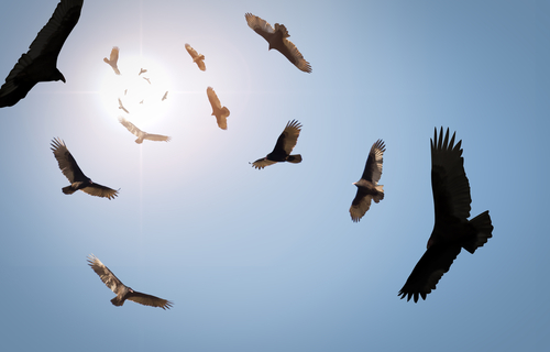 ハゲタカは死肉を主なエサとするハゲワシやコンドルなどの総称であり、ときに弱者を利用する悪者のたとえにも使われることもあります。