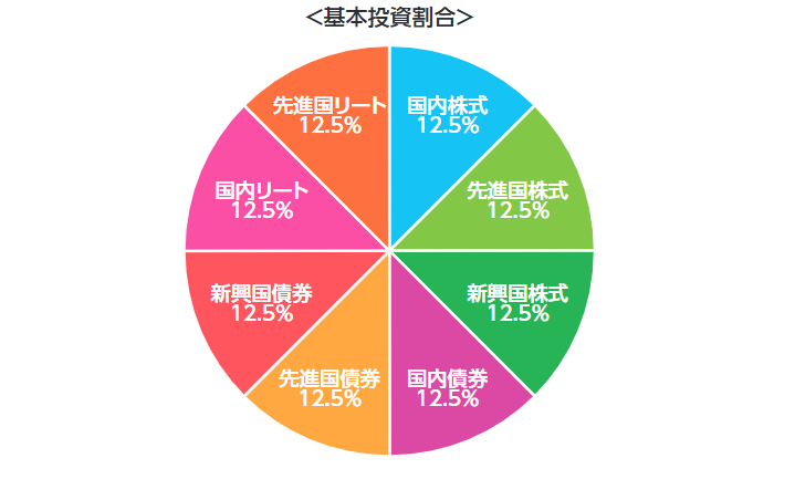 8分割というわかりやすくバランスの良いポートフォリオと、圧倒的に低い信託報酬(年率0.1512%パーセント)、資金の成長を最優先において分配金を極力出さない方針で運用していることが特徴です。