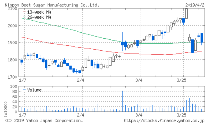 | 甜菜糖 (2108) | 1,902円 | 製糖準大手。国産ビート(てんさい)糖では国内首位。円高になれば飼料原料の輸入コストが下がり、収益の向上が期待できる。砂糖市況による業績への影響が大きく、TPPによる砂糖販売価格の動向には注意が必要。 |