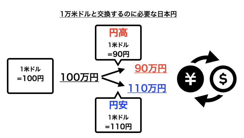 円以外の通貨(米ドル、ユーロ、ポンドなど)に対して、円の相対的な価値が上がることを「円高」、逆に円の相対的な価値が下がることを「円安」といいます。