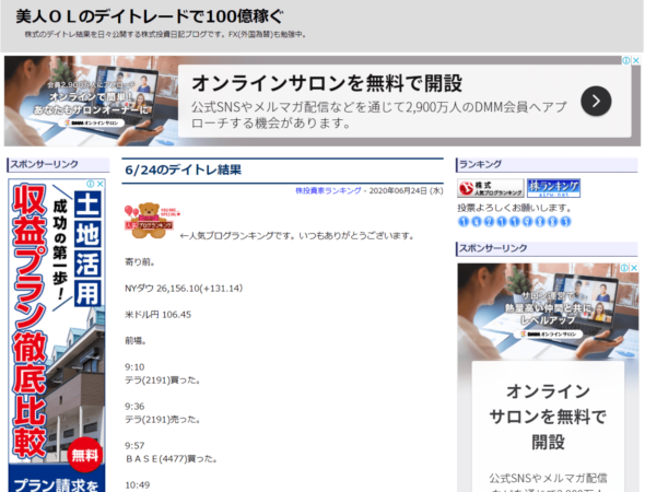「美人OLのデイトレードで100億稼ぐ」は、何時何分にどの株式を買ったか・売ったかが分かりやすい収益報告ブログです。