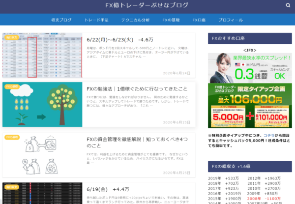 「FX億トレーダーぶせなブログ」は、FXのデイトレブログです。1日の収益が1万円から10万円ほどのことが多く、初心者の方にとっても現実的な金額で参考になるブログです。