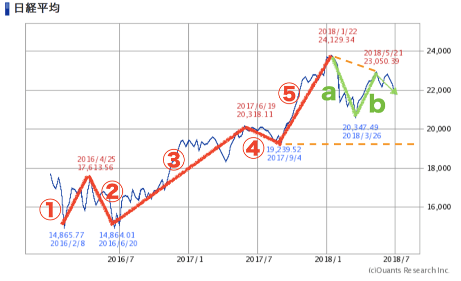昨年までの株価上昇は、2016年2月を第1波の始点とする上昇波とみることができ、そのピークとなる第5波の終点は、2018年1月の高値とみることができます。