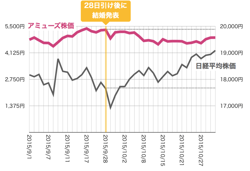 その後、日経平均株価はすぐに回復したのに対し、アミューズの株価の戻りは鈍く、事務所の看板である福山さんの結婚による影響の大きさを反映するような結果となりました。