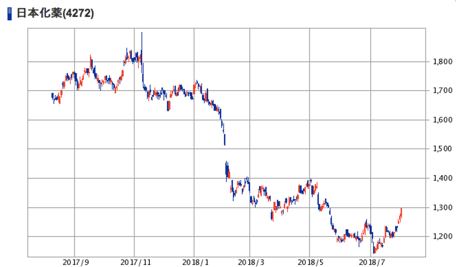 | (4272)日本化薬 | 株価 (2018/8/1終値) | 1,297円 |