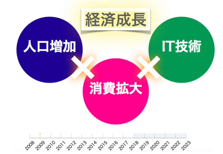 ãã®ããã«ãã€ã³ãã§ã¯ã人å£ïŒåŽååïŒå¢å ãã»ãæ¶è²»æ¡å€§ãã»ãITæè¡ããšãã£ãããŸããŸãªèŠçŽ ãæãåããããé£èºçãªçµæžæé·ãžã€ãªããããšãæåŸ ãããŸãã