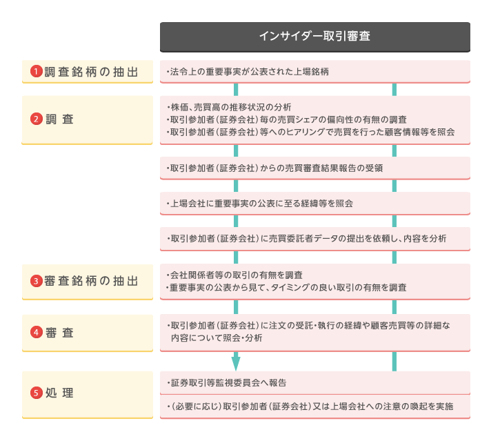 毎日株式市場では日本取引所自主規制法人によって、投資判断および株価に大きな影響を与える情報が発生した銘柄についての売買動向・情報精査をする「売買審査」が行われており、法令違反とみなされる行為があった場合にはその取引情報が証券取引等監視委員会に報告されています。