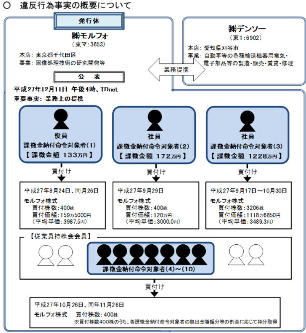 この事例では、モルフォと株式会社デンソーが業務提携をする重要事実を知りながら、同社株式を公表前に買い付けたことが罰則の対象として挙げられています。