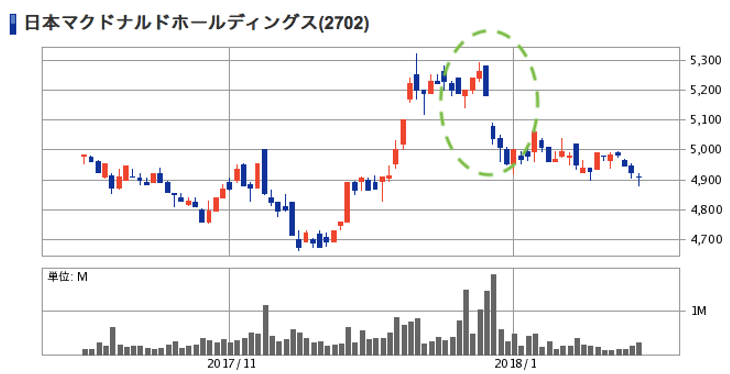 | 優待内容 | 優待食事券(年2回 6月・12月) (バーガー類、サイドメニュー、飲物の3種類の商品無料引換券が1枚になったシート6枚綴りで1冊。全てビックマックセット(690円)に交換すると、1冊あたり4,140円相当*) 100株以上:1冊 300株以上:3冊 500株以上:5冊 | ||