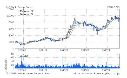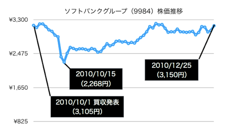 一方買収する側(ソフトバンク)の株価は、市場評価に比べてかなり高値での買収となったことで、買収発表後には株価を一時30%近く下げています。