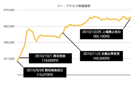 このM&Aでは買収発表前の9月28日のイー・アクセス株価15,070円の約3.5倍、52,000円の評価額による買収でした。