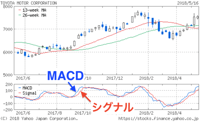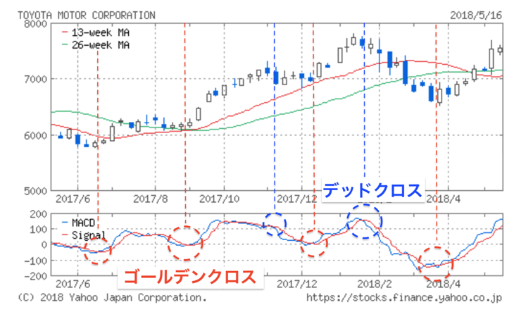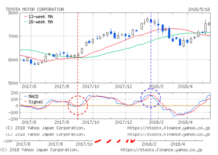 では、実際のMACDと株価の動きを比較しながら確認してみましょう。