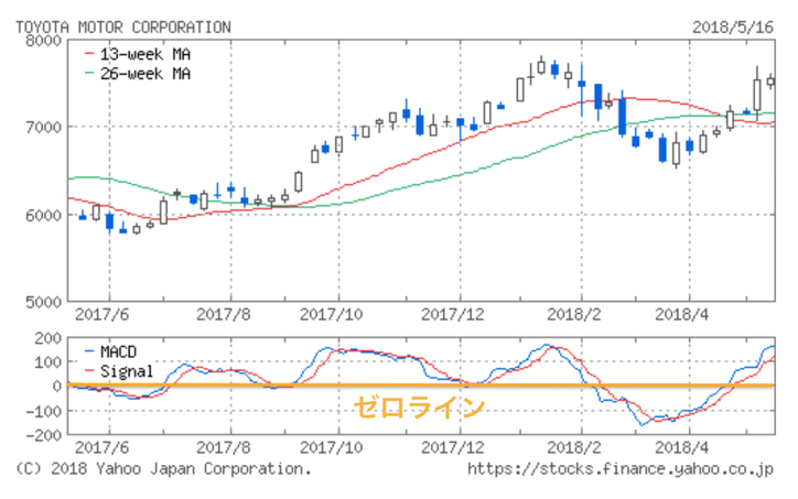 MACDラインがこのゼロラインの上にある(MACDがプラス)