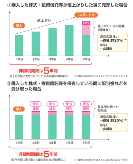 NISA口座で株を購入した場合には、年間投資額120万円までの譲渡益、配当金が最長5年間(6年目以降新たなNISA口座に移行(ロールオーバー)した場合は最長10年間)非課税となる税制優遇措置を受けることができるため、この制度を利用しない手はありません。