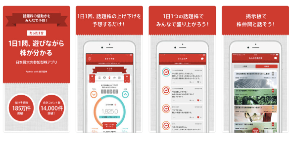 株価予想アプリ「あすかぶ!」は、1日1つ指定される銘柄の翌営業日の株価(「あす」の「かぶ」価)が上がるか下がるかを予想するスマートフォン向けアプリです。