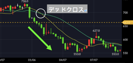 逆に、デッドクロスは短期の移動平均線が長期の移動平均線を上から下へと抜ける現象です。