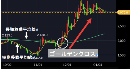 ゴールデンクロスは株価が上昇した際に、短期の移動平均線が長期の移動平均線を下から上へ抜ける現象です。