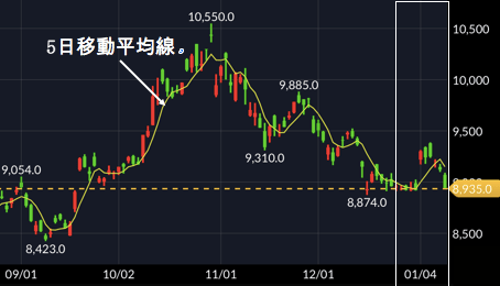 移動平均線が右肩上がりならば株価は上昇傾向にあり、右肩下がりならば下降傾向にあることが分かります。