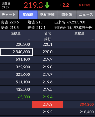 äžèšã®æ¿ã§ã¯220.0åã«2,840,600æ ªãšãã»ãã®å€æ®µã«æ¯ã¹ããªãå€ãã®æ³šæãå ¥ã£ãŠããŸãã