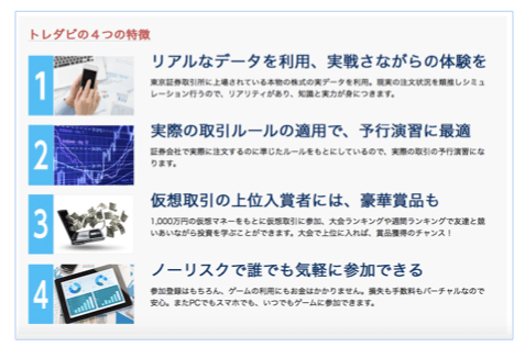 ãã¬ããã¯ãå®åšãããªã¢ã«ãªæ ªäŸ¡ã䜿çšããããŒãã£ã«æ ªåŒæè³ã·ãã¥ã¬ãŒã·ã§ã³ã§ããåå¿è ã ãã§ãªãã蚌åžäŒç€Ÿã®ç ä¿®ãæ ªåŒæè³çµéšè ã®ãã¬ãŒãã³ã°ã«ãå©çšãããæ¬æ ŒæŽŸã§ãã