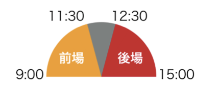 ç«äŒæéã¯9:00ã11:30ã®åå ŽïŒããã°ã»ååç«äŒïŒãš12:30ã15:00ã®åŸå ŽïŒãã°ã»ååŸç«äŒïŒåãããŠããŸãã