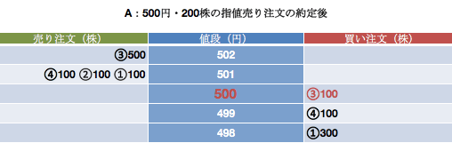 äŸãã°ã500åã§200æ ªã501å200æ ªã®å£²ãïŒæå€ïŒæ³šæãåºãŠãããšãã«ã300æ ªã®è²·ãã§æè¡æ³šæãåºãã°ããŸã500åã§200æ ªãæ¬¡ã«501åã§100æ ªãçŽå®ããŸãã