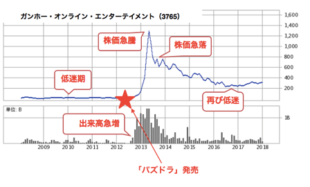 そのほか「パズドラ」で一世を風靡したガンホー・オンライン・エンターテイメント(3765)の株価が、2012年〜2013年にかけて1年ちょっとで80倍近くまで急騰したことを覚えている方も多いのではないでしょうか。