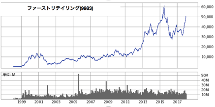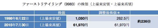 その後もファーストリテイリングの株価は上昇し、終値ベースで1998年6月22日(上場来安値記録日)から2015年7月30日(上場来高値記録日)までに株価は約236倍とさらに上昇し、日本を代表する大型株へと成長しています。