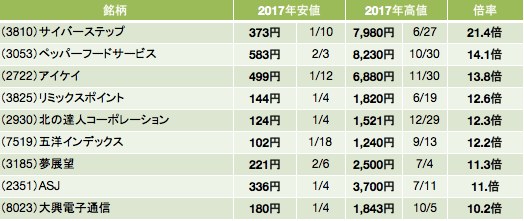 ここでは2017年中に株価が10倍以上に高騰した銘柄をご紹介します。