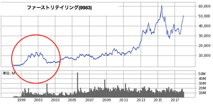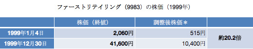 ファーストリテイリング(9983)の株価は、1999年の1年間で約20倍に高騰しています(終値)。