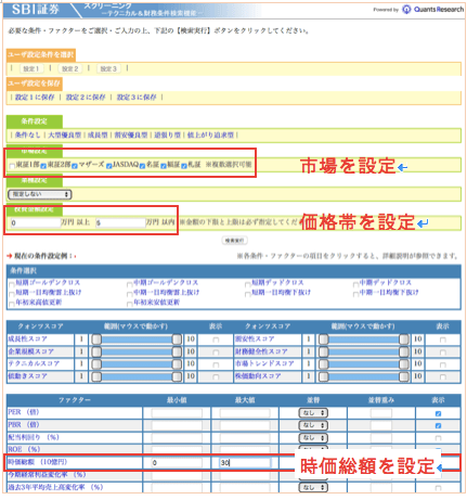 多くの証券会社では、スクリーニング機能を提供しているため、これを積極的に活用しましょう(画像はSBI証券)。