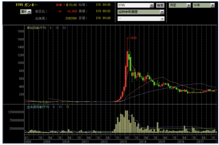 例えばソーシャルゲーム黎明期に『パズドラ』をリリースし、大ヒットしたガンホー <3765>の月足チャートを見てみると、