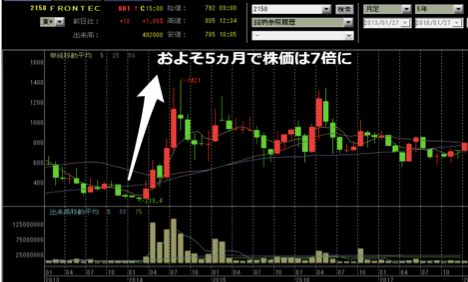 例えば上記画像の「人工知能」の銘柄にあるFRONTEO <2158>の月足チャートを見てみると、2014年1月には200円台だった株価が五か月程度で高値1421円をつけていることが分かります。