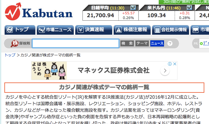 参考:株探 カジノ関連が株式テーマの銘柄一覧