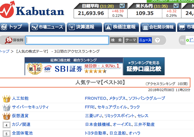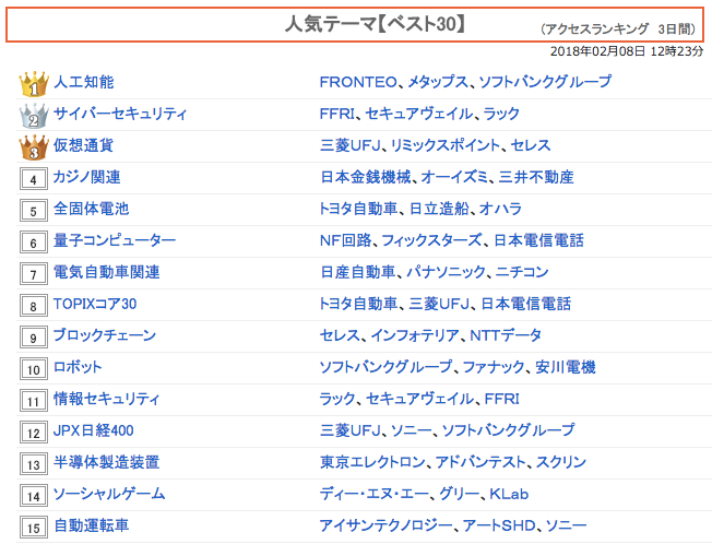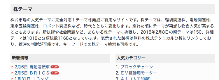 上でも例に挙げた株探では、テーマをクリックすると更にその関連銘柄群をチェックすることができます。