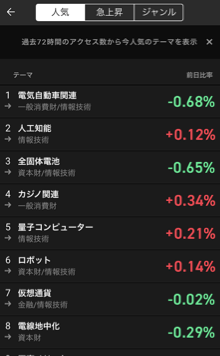 直近の騰落率などもあわせて確認できるため、「何が今盛り上がっているのか」ということを確認することができます。