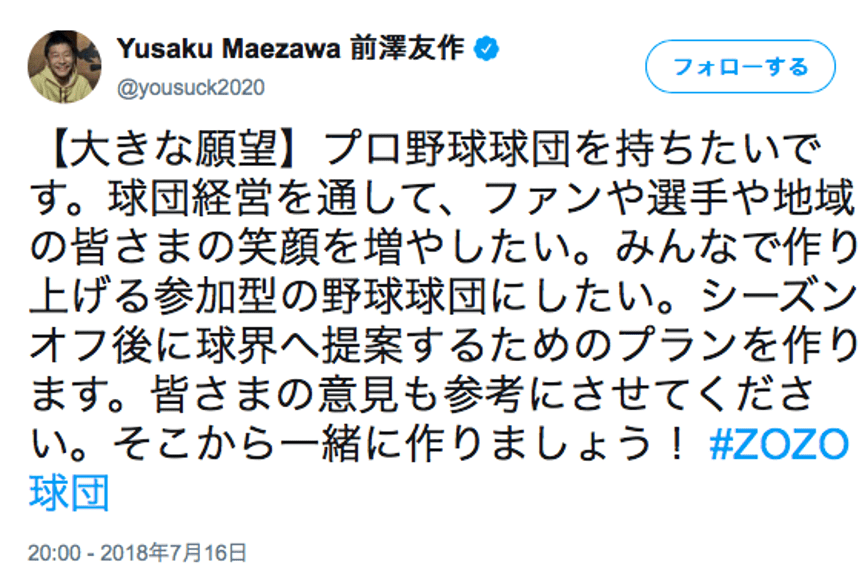 日本でも、ファッション通販サイト『ZOZOTOWN』を運営するスタートトゥデイの前澤社長が、自身のツイッターで「プロ野球球団を持ちたいです」というツイートをし、プロ野球界への参入に意欲をみせています。