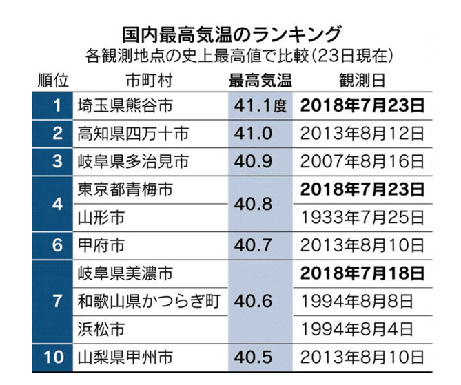 7月23日、埼玉県熊谷市で国内観測史上最高の41.1℃となり、5年前の2013年8月に高知県四万十市で観測された41.0℃の記録を更新しました。