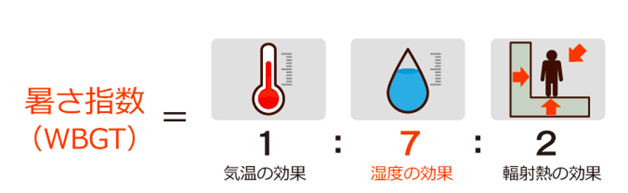 暑さ指数(WBGT)は人体と外気との熱のやりとり(熱収支)に着目した指標で、人体の熱収支に与える影響の大きい1、湿度、2、日射・輻射(ふくしゃ)など周辺の熱環境、3、気温の3つを取り入れた指標です。