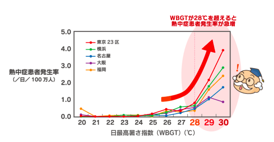 暑さ指数が厳重警戒(28℃)レベルに達すると、熱中症患者は急増する