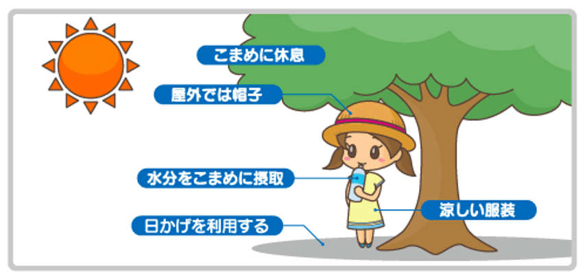 まずは熱中症にならないこと、それには休息や水分補給など、基本的な対策を、“症状が出る前”に“意識的”に行うことが大切です。