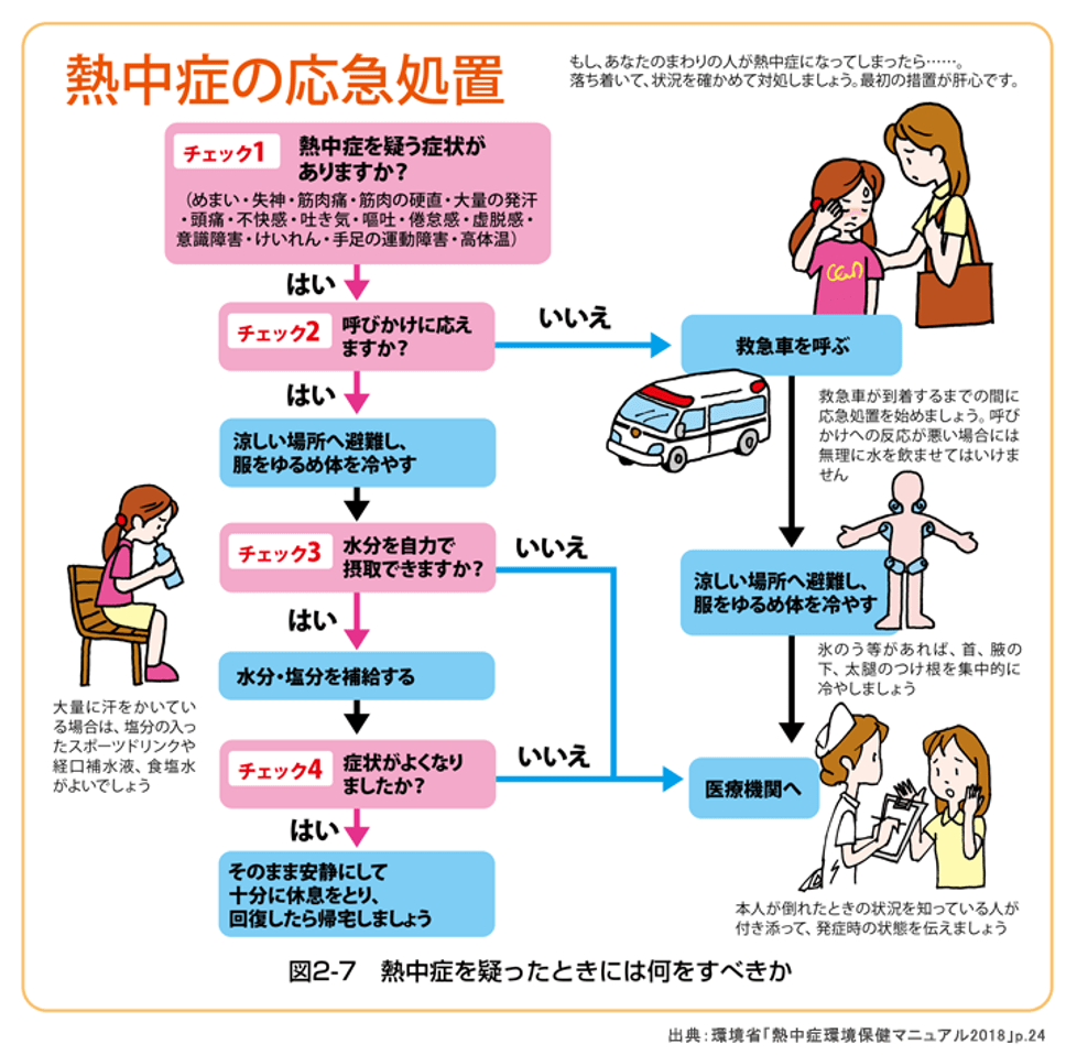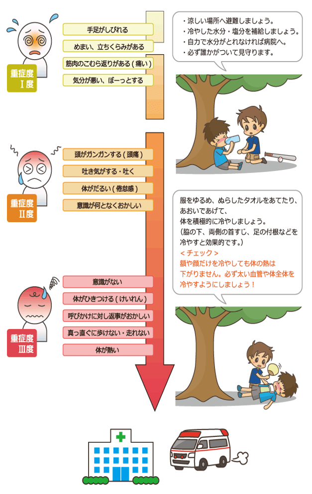 このような症状がある場合でも、意識がしっかりした状態であれば、涼しい場所へ移動し、体を冷やし、休息・水分補給を行うことで、多くの場合は回復します。